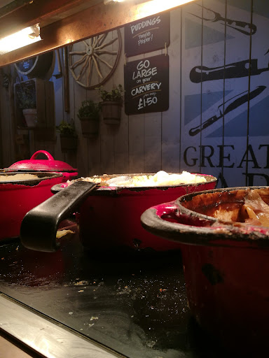 Read moreStaff were very welcoming and helpful. A very homely bar area; dining area likened to other carverys, lots of seating. I asked if I could have the more well done piece of beef from one end of the joint but was informed it was all the same and he surprisingly, despite my asking, said he wouldn't cut the end I had requested... the pork was very good but sadly no crackling (always a favourite part of a roast pork dinner)... Turkey also good. Dinner of the vegetable trays were nearly empty and not refilled for some time.... all sources had run out in the serving dishes..on asking a very lovely waitress kindly brought some to our table, however (despite it only being 6.45pm on a Friday evening) they had totally run out of apple sauce which was a shame. Roast potatoes and other veg were good. We certainly had more than enough to eat. The toilets are in need of some tlc, needed cleaning as a starter from top to bottom and a new coat of paint and one sink tap was broken, the wooden sides looked like they've seen better days. Overall, I would still say if you want a filling bite to eat or somewhere to meet and have a drink before/after a flight it would probably hit the spot for you, but if you're after a fancy night out this would not be my first choice. Depends what you're looking for. Thank you to our very tentative waitresses... they were all very...