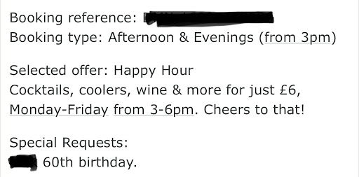 I had also mentioned on the booking form that it was my daughterâs birthday but this wasnât acknowledged at all.