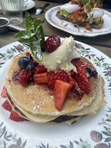 A delicious array of obviously hand made cakes and several varieties of cold sandwiches on over-generous focaccia bread. I'd never had a cold Ruben before but it was very tasty. My partner's smoked salmon with pickled onions and ribbons of cucumber was gorgeous. The carrot cake was unctuously spicy and nutty with just the right amount of cream cheese icing. Tables inside or outside in a verdant bower. Flat white coffees were a bit dear considering the portion size. Loved the freely available ice water. Local eggs and apple products available. Take away goodies too tempting....