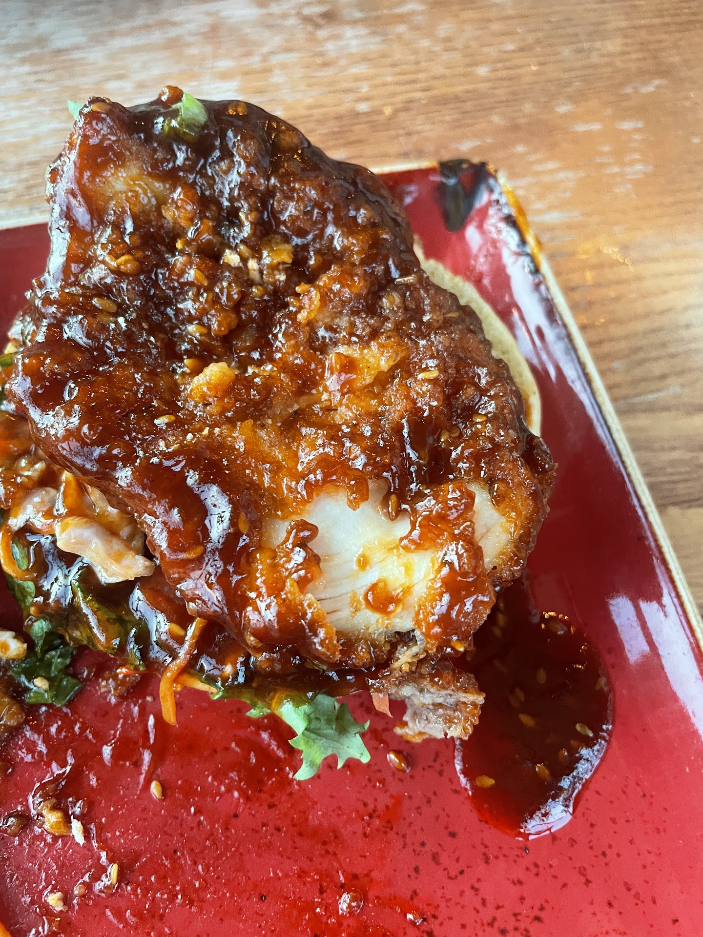 I had-Korean chicken burger, which tasted like it was burnt and it was just sloppy chicken and very gooey, the chips had wayyyyy to much salt and pepper seasoning on them (I’m guessing it’s salt and pepper seasoning) the onion rings just tasted like a freezer bag from Iceland so overall my meal was bad