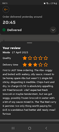 Honestly, they would look better as a business if they admitted the food they delivered to me was abysmal and apologised. I don't want anything from them I was simply making people aware that this is what we received and to avoid it. I did also say that the Thai Red curry and rice was nice but unfortunately that was the only part of the order that we ate.
