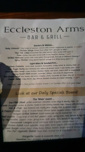 Read moreParty of 9 for a meal on a Saturday evening. Arrived at the Eccleston Arms at 7pm with a table booked for 7:15pm. Asked to have a drink and wait to be seated, not a problem. Once we were seated, and everyone had ordered we then waited around 45 minutes for the starters. No too impressed when they bring out a dish here and a dish there. Anyway, food was ok not a lot to rave about. Everyone finished the starters and plates were taken, It is now 8:30pm. Main courses arrive at 9:10pm a 40 minute wait. Out of 4 different steaks that were ordered 1 was sent back due to it being cold, the other 3 were like warm. The 'plain and simple' burger was only just warm and the bun burnt. The sizzling steak and fajitas weren't sizzling, but were at least hot on the plate. 2 people had the Rib eye steak, it was cooked how we'd asked (medium - rare) but again not warm. We both agreed we have had better steaks from Weather Spoons. Which isn't a high end restaurant. All finished the meals and let the staff know of our thoughts. Didn't bother with deserts, who knows how long they would of taken. It gives the impression it's trying to be in the same league as a Miller and Carter, but it isn't. Probably a nice place to go when it's a but quite and there's only 2 of you. Overall...