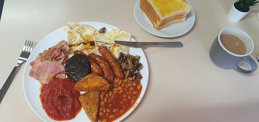 Lovely food fast service staff lovely, Jesus medium breakfast huge ha godknows what large is like but had beans 2 sausage ( proper butchers ones) bacon x2 again proper stuff, mushrooms not tinned rubbish, beans where heinze I think from taste, hash brown, fried bread, perfect cooked runny fried egg, you can have tomatoes and black pudding too but I don't like them so left them off, also two thick rounds of toast, and a drink of choice,...