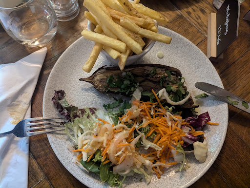 Two of us ordered the vegan main dish of miso infused aubergine steak with chips. The chips were good and the salad was very tasty. The aubergine was okay, it was half a baked aubergine marinated in miso. We had a starter (soup of the day) but had to order more chips after finishing our plates because it simply wasn't filling enough for us. Our friend ordered the burger which she said was good.