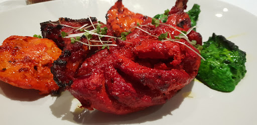 Starter - Mix Platter -- Chicken Tikka, Hariyali (Green) Chicken, Kebab and Tender Lamb Chops. A lovely mix of everything here (minus the seafood of course). The green chicken is a popular north Indian choice. It came with a sweet dipping sauce. All the meat on the plate was hot and tender and presentation wise it was appealing. I found no issues with the quality of the meat and enjoyed this very much. There was no spice at all to all the items on this dish though remember I really love spice.