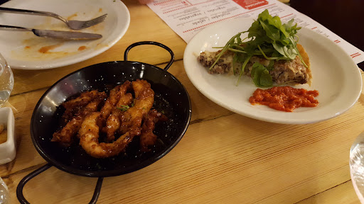 This was the second time that I visited this place. At first I did not think of writing a review, but this second visit prompted one. This is a very difficult review to write, being Spanish and comparing what I have at home with this surrogate is definitely unfair. To begin from the beginning there is a clear misunderstanding from British nationals and all other nationalities who are adopting the term "tapa". When it comes to defining what a tapa is, we have to look back into Spanish history. Tapa comes from the verb "tapar", to cover, when there was a need to protect e.g. wine in the flies infested inns from them falling into it, drinks were covered with a small plate to protect them, "la tapa". Food was prepared in big quantities and the legend says that small portions of pot cooked food started to be added to the small plate/ cover, hence the word tapa FYI. From then, as you can read on the menu, it has degenerated into any strange assortment of skewers on a plate, salmon teriyaki, to name a few, and any other strange concoction of plates that they want to sell as Spanish but that unfortunately do not represent the Spanish cuisine tradition, or tapas culture, as tapas are not eaten at the table, always standing up. Tables are for full rations. To be honest it would be a hard sell for most of the British population's taste to be confronted with what we really eat as tapas in Spain, for example; oven baked pig ears, fried blood, offal, squid eggs on the grill, sea anemone, you get the point. But going back to the review, if I ever started it, this is a nice restaurant aesthetically, the service is good and attentive and food gets prepared quickly, and some of the dishes are nice, actually quite decent. Up to here the nice part of the review, from here onwards the not so nice. To begin with, the music, loud, very loud, like you need to shout to hear yourself, and who as ever in a proper Spanish restaurant gets music being blared out like this, and the Gipsy kings on repeat, who happen to be French, come on, enough with the made up stereotypes. Then is the food, overpriced for the types of tapas, to say the least. Almost Ā£7 for the mushrooms, you've got to be joking. Nothing that you can find in the menu gets imported other than the cheese, if I do reckon right. All of the ingredients are vastly available in any UK supermarket. Why do we have to pay through the nose? You could argue that the asked price reflects the quality of the dish. Actually the quality is not too bad, as I said before, most of them are tasty but that was not the case of the Spanish omelette, or the Carrilleras (cheeks), that in my first visit I found tasteless. The sauce was just coloured water. Carrilleras is one of my favourite dishes, and this failed attempt was very poor. So, let's have a look now at the Spanish omelette, it really needs special attention, A&E attention. It really needs an infusion of life, as it was stale, dry and probably made the day before. Tesco has a better one from the shelf, so you can imagine my reaction. It was criminal, no sugar coating here. So if you say after trying it that you do not like the Spanish omelette, there is nothing wrong with you, you are right. Basically and this is what I really do not like about these so-called Spanish restaurants is the cultural appropriation or should I say misrepresentation of the Spanish cooking tradition or culture in general. I would not mind if they stop using the Spanish language in the menus so they stop conveying a false relationship between the food they offer and anything far related to Spanish food. Just using english and describing the dish is far less misleading and far more honest, you will sell less, that's the catch. So I'm sorry but this is not for me, please go and try yourself, you may enjoy it, do not take me wrong, mine is just an opinion, like anyone's else, an informed one nonetheless. You might be wondering why I went twice, am I a masochist? š , no, both were work related occasions. So there might be even more visits...