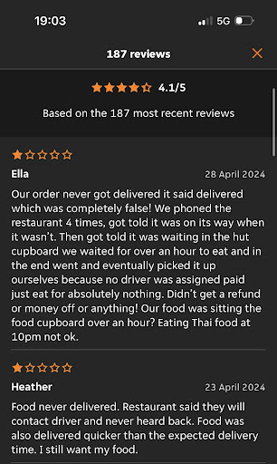 Read moreI’d like to warn anyone who wants to eat a take away from here and order from Just Eat to not do that ! I have had a bad experience, plus 2 friends of mine. We spent over £60 for a take away from bad communication and poor customer service from both the Thai restaurant to just eat. What the restaurant will do is say on the app that the food is delivered so they are guaranteed that they won’t lose money and that you won’t get a refund through the app. The food was cold, I’ve also reported this to the local health service because we were all unwell this morning. We were waiting over 2 hours for food! Mistake made ! We should of cancelled the order! Please don’t get into the same situation as us. Lost our money and food was disgusting! After waiting so long and not be able to re-order something else we didn’t have many options. Sala Thong is much nicer, really good service and delivery!! We just regret not going with that first choice now. Look at reviews on Just Eat first before ordering, I wish I did now!!! People say...