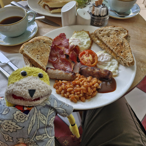 Ic took us out for breakfast. Only the second time I have been here and it was a super choice. Only a short walk off the High St. A small cafe with a couple of outside tables. A pleasant spot on a warm Spring morning but the road leads to the main Cheadle car parks and is thus busy. I had a full (large) English breakfast, £8.95. Excellent. Ic also ordered a sausage baguette. Two good black coffees. About £21 the lot. Pleasant indoor seating. Seems to have a loyal set of regulars. Need to come...