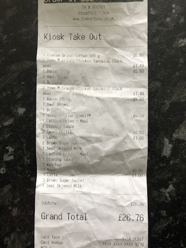 Read moreNO STARS ABSOLUTE SHAMBLES…Cannot emphasise enough why you all need to AVOID this place. After having been in Canada and enjoying many Tim Hortons, we decided to try the Stockpot branch of said business. Massive mistake, on entering there was an aircon unit leaking into the middle of the restaurant, you then have to use the machines to pre-order your food and then collect it when your number is called .We ordered our 2 chicken burgers 2 lattes and a bag of course grind coffee 300g this cost nearly £27 the burgers were over £8 each and as you can see by my pics they were soggy and unappealing this however was pale in comparison to the 4 times I had to return both burgers as ( I kid you not) they kept getting the PRE-ORDERED burgers wrong items missing , 2 stone cold CHICKEN burgers, a meat burger , etc it was ridiculous. The final time I went to the counter as none of them came back with the stated hash browns on they just handed me a bag of ingredients for me to finish my £8 each pre ordered burgers.The staff are ignorant,poorly trained, badly led as it seemed no one was taking control and as we waited for our order, at least 3 other orders were being brought back to the counter as they were all wrong too.I think Tim Horton would be ashamed of what you are doing in his names sake. I want a refund as the inedible food was horrendous.HOWEVER great coffee. My advise ONLY...