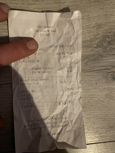 The atmosphere was nice, we prefer sitting in the bar area as there's less craziness. The food was spot on, my partner says the best out of three we've tried. The guy serving us was polite and generous with the meat. Unfortunately, the rest of the staff were very much wrapped up in their own affairs, this is where the other Toby Carveries have been better. We walked in, three staff members were chatting to each other, one very loudly about changing shifts. Two continued to chat right in front of us whilst a lady gave us her attention and gave us a 15 minute wait or sit in the bar area which we were absolutely fine with (we hadn't made a booking). We went to the bar and after asking for a refillable drink, the guy handed my partner Pepsi (which he didn't ask for). He didn't complain and drank it anyway, but unsure why it was prefilled for him with a random selection. Just as he finished serving us, the same guy from the entrance loudly interrupts the end of his service to tell everyone either his or someone else's shifts had changed. He had comolete disregard for his customers. I wish I'd caught his name. Also, just from observation, the staff were constantly hanging around in small huddles chatting around the bar or entrance, that can be intimidating to some customers as it makes them unapproachable. Lastly, we went to leave and not one person took the time to say 'goodbye', 'thanks for visiting', 'Happy Christmas', nothing. It was a shame.