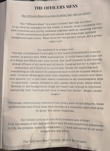 A really fantastic spot with lots of great entertainment and atmosphere I love the bustling bar and the concept looks really well executed, the gents on the bar are very impressive; welcoming and knowledgeable with plenty of flair! All of the staff are good fun and dressed fantastically in the 40s theme The menu has recently been updated and is packed with delicious, well-balanced cocktails that are difficult to choose between, the Dig for Victory is one of my favourites! For some of my more particular friends, the bar team were more than happy to make bespoke cocktails based on tastes, and preferences and they were fantastic! And so well-presented! It's definitely worth arriving earlier than the entertainment starts (around 9) as the bar gets really busy and it's 💯 worth watching the cocktails being made with a little flair The bar is usually open late (1am) on Friday and Saturday so no need to worry about an early kick out They offer group masterclasses with 40s style fun and games too that sound like a lot of fun. definitely on my to do list Sorry there...