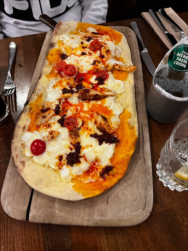 Read moreWe went for a quick lunch, though it turned out a bit quicker than expected. We were quickly seated and ordered a garlic bread starter to share with balsamic onions and cheese on top and I had a chicken calzone and the wife a chicken salad. The garlic bread was nice, although the cheese and onion topping wasn’t exactly generously applied, with a couple of pieces having a bit on and the rest going empty, which is annoying when you’re paying a premium for those toppings. The mains arrived and they were both tasty, (though a bit more filling in the calzone would have been good). We were going to have dessert but the table that got seated to the side of us had a family with a couple of young children. Unfortunately, the kids were very vocal with much screaming, and apart from a half-hearted “hush” at the start, the parents seemed quite content to let the howling continue unabated, on and off. We decided to forgo dessert rather than get a migraine, so paid up and left.
