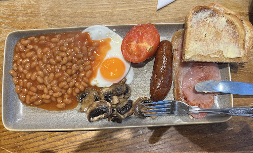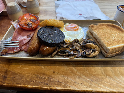 Bacon says thick cut on the menu. It is not. Says grilled tomato on the menu, we got lukewarm tinned tomatoes. The 'serving' of toast is just one piece of toast cut in half. The HP sauce and Hellman's mayonnaise bottles had obviously been refilled with cheap stuff. The staff kept leaving the door open on a cold day, the older gent next to us had to get up to keep closing it and ended up moving seats. There are signs everywhere that the owners have put up complaining. Moaning about people using the toilets, moaning about people using laptops, moaning about non-customers using facilities. Big yellow 'warning! CCTV!' signs. It really ruins the atmosphere of what used to be the best atmosphere of any cafe I've visited...