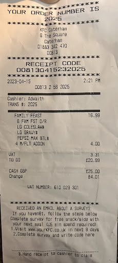 Read morePossibly the worst branch of KFC anywhere. Visited on a Saturday night when It should be busy but it's dead. Skeleton staff, tables not cleared. Took my order, paid for it and waited for a painful 15 minutes for it to be ready. When it arrives they announce they don't have the side I chose. I ask for the other side but they don't have that either. So I get an unappetising small box of coleslaw. They are having "stock issues". No thought to mention this as I ordered and paid. The same excuse I get every time. The most unorganised and slow service and it is consistently like this at this branch every time I go. I wouldn't personally ever go here except I failed as a parent and my kids like this rubbish and I cave in...