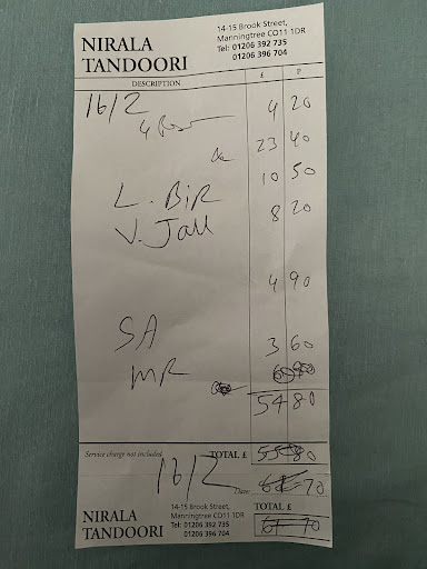 Ā Ā Ā Read moreRude and overcharged!! I ordered a biryani and the vegetable curry was just potatoes, no vegetables. When I queried this, I was told that if I wanted cauliflower in it that I should ask next time! Why? Itās a vegetable curry?! They were being cheap by using potatoes only. Iāve never heard such a ridiculous response. When we received the bill, it was just an amount so I asked for an itemised bill. They said they ādonāt do thatā even though itās written out by hand. I asked again and he went off grudgingly to get one. Pictured is what I received with the corrections. I could not read it- it was initials and scribbles. I asked how was I supposed to read this and they pointed out what all the scribbles meant. I was saying again that I could not read it and he literally walked away from me while I was still talking. Heād clearly decided he had no more time for me and IGNORED a paying customer! We were overcharged for drinks and the amount was corrected a few times going from the first total of Ā£67.70 down to Ā£54.80ā¦. about a Ā£13 overcharge!!! The bill was paid and I told them I would never come back while he was walking away from me again! The two young waiters were very helpful and professional and I gave them a tip. Iāve honestly never been treated like that by restaurant staff/manager and if I could give 0/5 I would. Absolutely disgusting service and not impressed with the veg curry missing the veggies. I also feel the portions were small. Avoid...