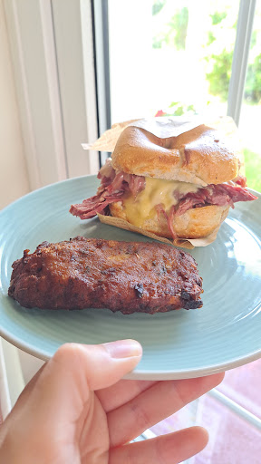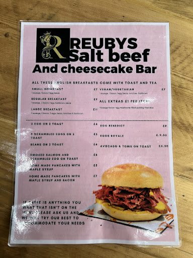 Read moreMy husband and I agree on few things in life, one thing being that if we found ourselves on Death Row, a Reuby's salt beef beigel would be our last meal of choice. We've never had a sandwich like it. We just ordered two for our lunch, and the 5 or so minutes we took to eat them were spent in perfect silence. We meditated over these sandwiches, they are that good! We genuinely feel these might be contenders for the best sandwich in the world award. The latkes we ordered alongside are a delicious alternative to a hash brown and we thank you for the, also very delicious, piece of cake you added to our order. I wish we had the funds and the waistlines to eat at yours every day. Thank you again for the amazing eats! P.S. Last time we ate in the restaurant and the atmosphere was excellent! Like a little friendly community that we were welcomed into...