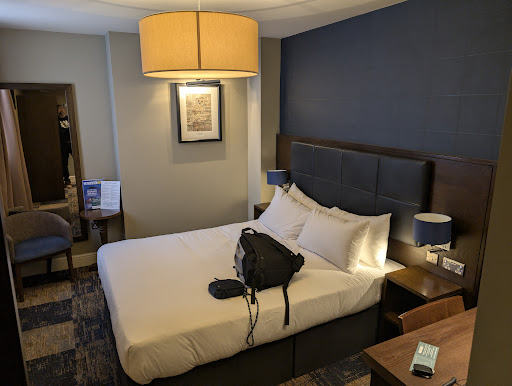Read moreWe were visiting a very sick friend in Andover and needed to be central. On first appearance, we thought we'd made a mistake. As we parked in George's Yard, the back of the pub/hotel felt grim. Husband took ages to find someone who could check him in, hence only 4 stars on service. He had to wait until the bar staff could serve him to get key-card and details. But other than that, our stay was really excellent. The security arrangement between pub and hotel rooms means you felt quite separated from the downstairs clientele (room key card opens the 2 doors through Hotel reception on 1st floor). Once you are in the maze of corridors it's whisper quiet. Our standard double room was small but totally adequate for our needs and the bathroom was enormous. Piping hot water with a great shower. Very comfortable bed, spare pillows, tea (even decaf), coffee, hot choc, biccies and free bottles of water. It also felt clean and not above a pub! Didn't hear a thing: no people, no traffic, no sounds. Pleasantly surprised. Breakfast menu choices very impressive and value for money and free coffee appreciated. Will stay again when need to visit friend; this place met...
