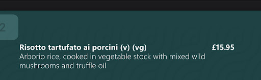 Read moreThe excitement of ordering a wild mushroom porcini risotto with truffle oil and wild porcini mushrooms - only to get home and discover itâs more like Tescoâs own𤏠(see attached menu photo!) The âwild porciniâ turned out to be bog-standard closed cup mushrooms, the so-called âtruffle oilâ was entirely undetectable (perhaps it merely passed by the bottle?), and the dish was so salty that I briefly wondered if theyâd mistaken the North Sea for seasoningđ¤Łđ¤Ł? Letâs not forget the extra Parmesan (I SPECIFICALLY asked for!) or should I say, the mysterious âmountain cheese imposterâ (as Italians call it!) sprinkled with the same âgenerosityâ as on an airline meal!