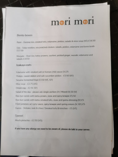 Fantastic!!! We got screwed over by another restaurant late on Saturday night and with several dietary requirements, we were a bit concerned, so we headed to Mori Mori. Initially, they weren't able to offer a table for 5, but a few minutes later, they found us outside and sorted us out.