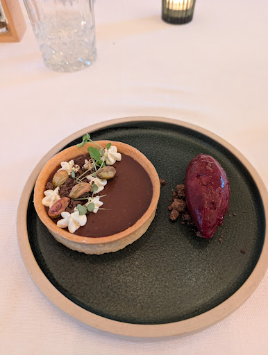 Absolutely stuffed, wine nearly finished and the only customers left we decided that there was room for pudding after perusing the desert menu. My wife had the Dark Chocolate & Pistachio Tart and I had the White Chocolate Parfait…yeah they were again top class in delivery!