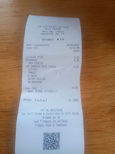 Read moreVisited for a quick bite after a day of shopping. The service by the ladies who took my order and gave me my order was nice. The food was amazing as always at Five Guys (however very pricey compared to other popular fast food chains). The chips and shakes are absolutely amazing and a must try for anyone and everyone. I had the veg sandwich with cheese which I always love. 5 stars for the food. The only downside I experienced was that there was a male staff member who I spoke to about obtaining a key for the disabled toilets to wash my hands just like everyone else did (as it was locked and the main toilets were out of service - only 4 stars because of non useable main toilets) however he gave the vibe that I wasn't welcomed at his store, unlike the other 2 ladies who served me. Very strange behaviour from the male colleague on that day hence only 3 stars for the atmosphere for me. Avoid him and everyone...