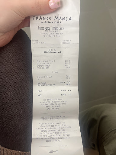 Read moreFranco Manca at the Trafford Centre truly delivers when it comes to amazing food and exceptional service. The pizza was absolutely delicious with that perfect sourdough base and fresh toppings that hit all the right notes. This was my second visit and once again I was blown away. The first time I came I received what I would call A âď¸ service and this time it was even better â A star star service.