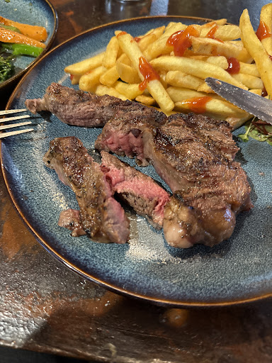 Our initial excitement and euphoria over a perfect steak and super friendly service on the first day was shattered in a disappointing way the next day. We had steak with peppercorn sauce and a bottle of wine to go with it. The staff member who served us was extremely friendly, gave us perfect service, and the fillet steak was cooked to perfection, medium rare, as requested. However, when we wanted to enjoy another delicious steak the following day, this decision was obviously not the best, and we regretted it very much. The steak that arrived was well-done and dry, overcooked in places, and still a tiny bit pink in the middle. When we pointed this out to the waitress (a different woman this time), the first thing she did was ask us to cut our fillet pieces in half. She then decided that the slightly pink color in my piece still looked quite juicy in the middle, while my husband's was a bit more cooked. She then took only my husband's piece back to the kitchen. When she returned, she condescendingly remarked that after measuring the temperature, the doneness was perfectly fine, but that they would redo it as a courtesy. I was left with my dry fillet without comment. By the time my husband finally received his medium-rare piece of meat some time later, I was almost finished eating. His doneness was as requested, but the meat was very stringy and the fries were almost cold. Apparently, the uncomprehending attitude toward us continued in the kitchen, as they sent the same fries, only cold, and apparently the least popular cut of meat they could find as a replacement.