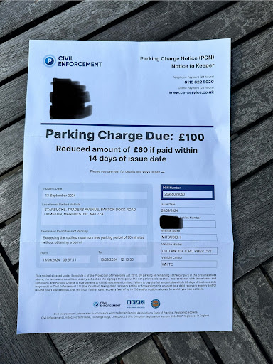 I will never step foot in a Starbucks again, I too received a £100 fine (reduced to £60 if paid early) in February 2019. I did not see any signs, but to be honest I wasn't looking for parking restrictions either, as the car park is purely restricted for Starbucks customers; staff at this venue should do more to inform customers of these 'rip off' charges. When I contacted the venue, the manager said ''yes, it happens to a lot of customers'' and recommended I try to appeal. I contacted Starbucks via Twitter and was also contacted by a regional manager (I think) both of whom communicated the 'corporate jargon' but couldn't really care less and basically said it wasn't their problem and could not do anything to resolve the issue. I was also further insulted by Starbucks, as they offered me a free voucher for a coffee to ease my pain - They are a joke!!!! - Unfortunately I have had to give one star in order for me to post this review; if allowed, this would definitely be a zero rating. Starbucks - you are a disgrace to...