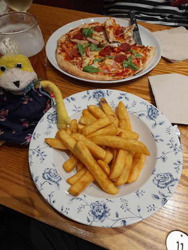 Excellent staff but the building is bland, an old shop I assume. Not one of my favourite Spoons but as usual excellent value. My pint of Peerless Langton Spin was under £2 with my CAMRA 50p off voucher. ( JOIN CAMRA...the Spoons vouchers alone almost cover your annual fee.) Needed food. Pizza n chips. Fine rather than a gastronomic delight according to Madge.