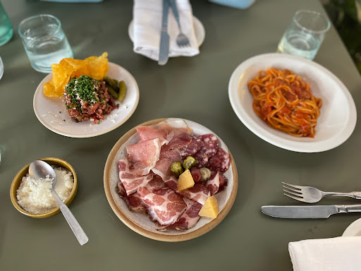Read moreWe hadn't booked and arrived at a busy lunchtime during the Easter weekend but were received in a cordial and welcoming fashion. We were sat at a raised side countertop where they sell a variety of quality produce. Service was jovial, attentive, and well paced. We chose two small plates as a starter, the butter beans and leek dishes which were beautiful in their simplicity and flavour. We then had cacio e pepe and bigoli pasta with garlic and olive oil which seemed to have chilli and radish in it as well. Both were perfectly executed and Al dente. It was clearly homemade and delicious. The glass of wine I had was nice and suited the dish but for a small glass, we thought it was expensive. The espresso was very nice and served in the correct cup and saucer but it could have been pre warmed. It was unfortunate that we were sat next to the door as the place also does takeaways. Some customers didn't close the door or consider fellow diners who were eating nearby. The door could do with an automatic door closer but staff were aware and did make the effort to close it when they could. All in all a fantastic lunch in a nice town which has limited other decent options and we would...