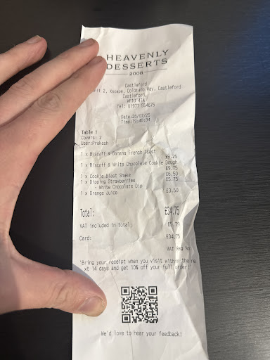 Edit 2 Jan 2024: the experience of eating at Heavenly Desserts seems to have been dramatically and detrimentally impacted by the rollout of their new app. This evening, we were led to our table and handed our menus without a single word from the waitress. I suspect she was inexperienced and lacked training or confidence as opposed to rude. After waiting approximately 10 minutes, I remembered about the app and found the code on the table. The Castleford restaurant doesn't provide WiFi (no Heavenly Desserts SSID showing) and there's no phone signal, so customers are reliant on using free WiFi from surrounding retailers in Xcape. When I'd selected our desserts and coffees, the app threw an error that I needed a validation code, which it couldn't send. The message advised us to contact support (no details of how to do this). We attempted to download the app on another device, create a new account and tried again, only to get the same error. We tried to flag one of the waiting staff down, even waving to get attention, to no avail. One appeared to be using their mobile phone! I stood up, walked toward where the staff appeared to be congregating and caught the attention of one of them, who seemed distracted as I explained my problem, then asked me to speak to another member of staff behind the counter before hurriedly walking away. I approached the counter and waited for 5-10 minutes. In all that time, the manager and two members of staff behind the counter didn't even acknowledge I was waiting. In the end, I returned to our table and my family and I walked out. I don't think I've ever felt so strongly that I will never return to a restaurant.