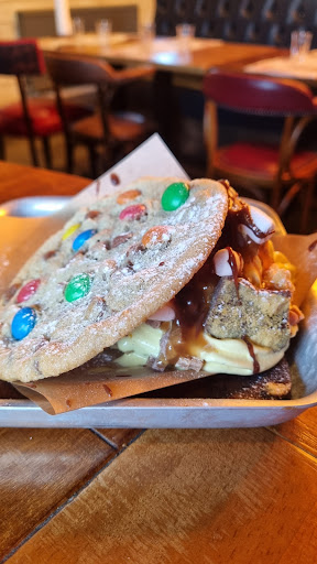 Food/drink ⭐️⭐️⭐️⭐️⭐️ We skipped starters and went straight for Mains. 4 out of 5 of us had the Bird and Beast burger which was actually incredible, the piece of chicken looked small but actually every bite was well balanced with beef, chicken, hashbrown, salad and the amazing burger sauce. The other person had ribs and in summary, you can pull the bones out of the meat with ease and the flavour is like a party in your mouth, unbelievably good! We grabbed onion rings and beans as sides to share and again both were top notch. The sour cream with the onion rings was a nice soothing addition to the whole meal but the amount of flavour in the beans with brisket blew my mind. Then we went for desserts and again the majority hit the Fro-Co which is frozen custard, and really plain and uninteresting to look at but a gorgeous way to end the meal with a really creamy texture and delicate custard flavour, really enjoyed it. Then someone had to get that cookie sandwich. Which is just pure indulgence and whilst a real challenge after a big burger, well worth having a go at.
