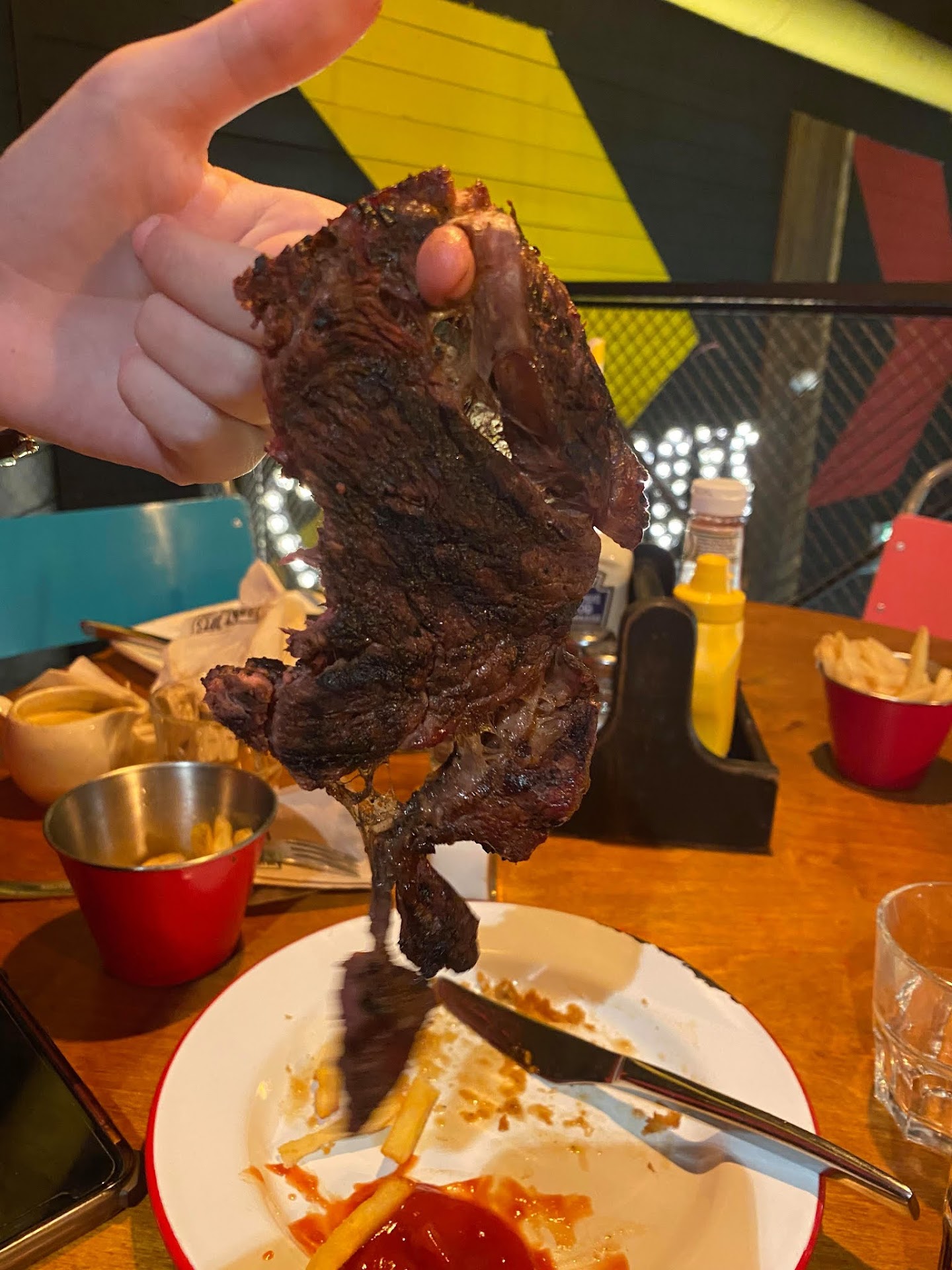 The waiter came to take our drinks order and as we had looked at the menu before hand we knew what food we want so asked if we could order food at same time. We asked how big the steak was as it wasn't stated on the menu..... Instead of telling us in oz what size the stake was she said "about this size, it's pretty big" and she used her fingers to show the estimated size of the stake 🤣🤣 I personally found this more hilerious than anything but not what expected from a grill restraunt. With regards to this one of our party members ordered the steak. Me and my husband both ordered the "top dog". After about 10 mins one drink was brought out (one of the mock tails, which was yummy) but no water for myself and other party member as ordered. After 45 mins of waiting and noticing every other table around us not having any food we asked how long it would be and if we could have the water we ordered, fair enough we was offered free drinks (which we decided not to go for) the food then came out 5 mins later.......