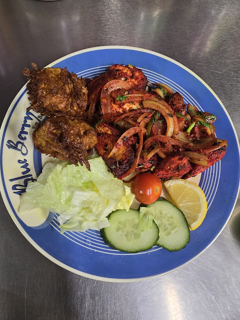 I wanted something a bit different from the usual offering and was suggested a 'murgi saag achar' (chicken green tikka) chicken tikka, chilli, onions, garlic, pickle, spinach with a side of garlic rice and Bombay aloo.