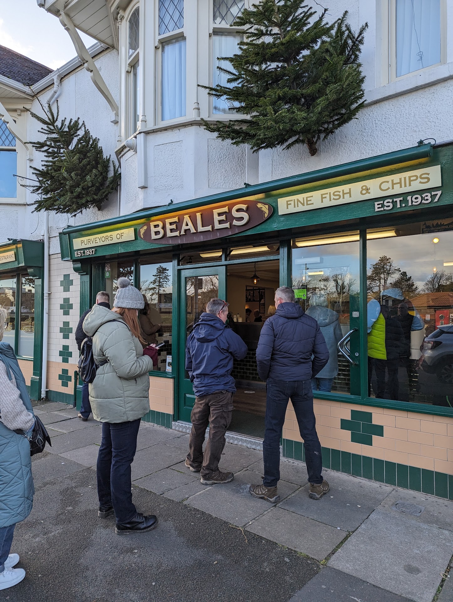 Read moreMy partner and I recently shared an endeavour to this run of the mill establishment. Upon arriving to our destination, Beales, we were greeted by an extensive queue of eager beavers. My partner was unable to even begin his experience at Beales for an approximate 10 minutes! This was most likely due to the very poor work efficiency shown by the staff. When my partner eventually spoke to the lady at the counter he ordered 2 Chips, a jumbo sausage, fish bites, curry sauce and gravy which to our surprise set us back £14.95! We also noticed that customers before us received an approximate wait time for their order, however we were not awarded such luxury and had to guess when our food would be ready. We also happened to witness an employee place an order (the exact same order as my partners!)a few minutes after us and much to our regret the employee received their food in a much more time efficient manner than we were granted. After placing our order with the kitchen we waited a further 15 minutes for the food to arrive. Upon tucking into our dinner we noticed that there was heaps of excess salt spilling out of the packaging (see picture attached). However, our food was fairly decent (for...