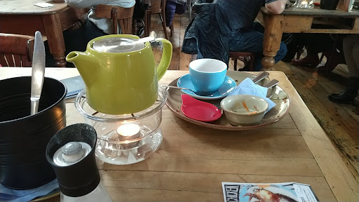 To start with the place was far to busy with strange hippy types. Some strange person came over and basically sat on our 2 person table with us. The 'home made' drinks were appalling. It was 2 quid for a crappy little carton of chocolate milk, and this was one of the cheapest things on the menu. Some of the only meat dishes on the menu were burgers (£10) for this you got a small burger and about 5 chips. The rest of the plate was a strange, vile tasting salad. The entire time we were there there was some terrible music, the type that you see people trying to sell (unsuccessfully) in busy shopping centres. Fortunately you could barely hear it over the high levels of noise in the place as hippies chatted pointless nonsense to one another. This is the sort of place that you see getting the piss taken out of on tv. Overpriced and self-important are two words that spring to mind. Will not be returning.
