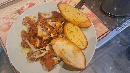 Was supposed to receive a 1L bottle of pepsi. I received 3 luke warm cans of Pepsi MAX. The 6 chicken wings were mostly bland gross batter. Barely any chicken inside. Pretty much inelible. As such so was the sweaty chewy garlic bread. The chips were somehow the only 'okay' thing that was sent. At that point I may as well has some fresh ones in the air fryer for a fraction of the cost. Partner likes the pizzas here but everything else has gone up in price but has dropped in quality. They're trying to charge 4.50 for adding stuffed crust 🤣 picture showing uneaten garlic bread and gross chicken breading. Been ordering her a while. I use to like their calzones but the last 2 ive had have been crunchy and disappointing. Another place gone...
