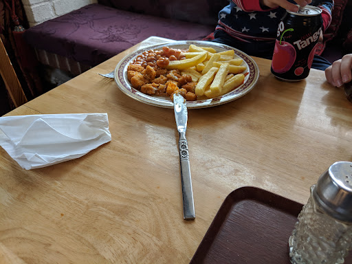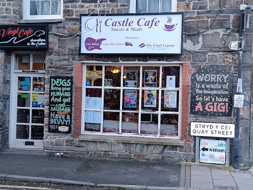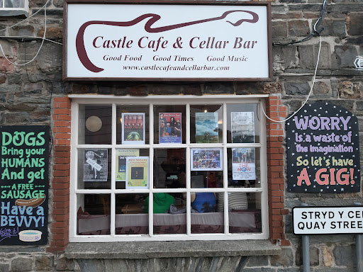 This is an unusual, quirky and unique small cafe perching on a corner at the top end of Quay Street, from where you can sit and watch the world and his wife walk by, either inside on a grey day or outside on the pavement under a colourful umbrella if it's sunny. The food is reasonably priced and freshly made and you can get an all day cooked breakfast including a mega sized portion, satisfying firm family favourites like cottage pie, lasagne and fish and chips and really good quality coffee. Cakes and fresh sandwiches are home made. April's Cawl is very popular here too. Staff are absolutely lovely, warm and friendly, chatty too if they've the time and willing to impart their local knowledge of places worth a visit to the tourists passing through. Steve, the owner, is almost always on the premises and is a larger than life character, jovial and funny and up for a chat about his little kingdom, the cafe above and The Cellar Bar below, which during the day is a vinyl and CD store playing music and attracting locals and visitors alike to browse and chat. In the evenings the Cellar transforms into an interesting live music venue with an open mic night on a Thursday and at weekends you will often find a good gig on here where local, national and sometimes international bands or solo artists perform. Musical tastes of the owner iare eclectic and so you never know what you might find here...from jazz, blues, folk, rock, pop, punk, indie,.....to psychedelic and even classical on occasion! The place is a treasure trove and well...
