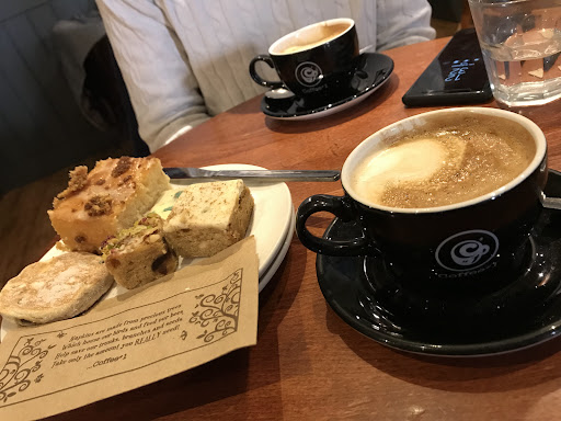 A welcoming and friendly coffee shop that even extends the warm welcome to dogs in a designated indoor area. There's a varied selection of seasonally cold or hot drinks, with frequent themed choices, such as pumpkin flavoured coffee at Halloween and fruit flavoured coolers for summer. There's a wide selection of really good cakes and pastries that are definitely a cut above those which coffee shop chains usually offer and, not only are they similar prices as elsewhere, the portion sizes are definitely more generous. Sandwiches and panini's are fresh, well filled and with a wide variety of choices, and there is also the usual toast, toasted tea cakes, muffins, Welsh cakes and such like on offer too. There should be something for anyone here and at a fair price. The house coffee itself is good, not too strong and not too weak, always hot and comes in the usual variety of ways. There are also regular guest coffees. The staff deserve a particular mention, because not only are they friendly and welcoming, they're also very smart and professional. It genuinely seems to matter to them that you get what you want, in the way that you like it. They don't passively wait to be asked either - I ordered a black earl grey tea and they thought to ask if i was allergic to dairy or lactose intolerant and then offered to provide either soya or coconut milk or lemon. That's really helpful, to offer options without waiting to be asked, and a refreshing change from just automatically being provided with the standard cow's milk that you then have to leave. Outdoor seating is limited and is on a slope but it is comfortable. There's plenty of comfy armchairs, regular chairs and tables scattered within that allow you sufficient space that you don't end up effectively sitting with the people at the next table. They open the front windows wide in summer too, which allows for a comfortable breeze to circulate within. All in all, I rate it as Chepstow's best coffee shop, based on the high quality of what they offer, the excellent staff, good portion sizes and the...