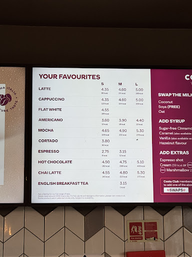 Read moreFirst visit to Costa in the UK. Far too expensive, very slow service. We had to wait in line for ages. Our order of panini was given to somebody else. Tables were dirty. Will never visit...