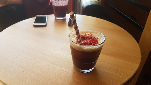 Usually I pop in for a cappuchino or mocha with a book about 8.30am. Staff are extremely friendly and the atmosphere is lovely but it does start to pick up by 9.30-10am. I absolutely love the decorations and the style inside since the redecoration (last year I think.) I have often gone in for dinner as well, highly recommend the strawberry lemonade, hot chocolate, brie and bacon panini, bacon sandwich and croissant. I don't use the toilets so can't comment but it's always been clean in the seating are with plenty of seating available (comfortable too). 4 stars because it is a bit pricey, you'd definitely have to be willing to spend a bit if you're having food and drink and especially for more...