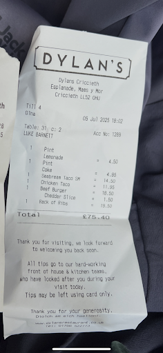 During a stay in Criccieth, Wales we came across Dylans. A seafood restaurant right on the beach front. Perfect, we thought. Mrs S rang them up and booked in. We arrived at the restaurant and realised you can't park your car on the premises unless you are disabled or only for staff! Not too much of a problem as there is a beach front car park just outside the premises. But that's when I realised it was a pay & display car park! 😬 OK, so it's a one off and there is nowhere else to park, so we bought a ticket and went in. The chap that showed us to our table was in a bit of a panic as to which table to sit us at? After about 5 minutes of us being stood about with our dog & him pressing keys on the computer and mumbling, he showed us to a nice table in the corner with an area where our dog could sit/lie down. I was surprised to see the restaurant was almost empty when we went in. With the chap panicking I thought they must of been full so couldn't understand why he was flustered? We were given menus and we both chose the Blade of Beef, with chunky chips, mushroom and comfit tomato with a peppercorn sauce. Not cheap at £24.95 each but, when we have the dog with us, we normally stay in our accommodation rather than fuss trying to find somewhere dog friendly, so this was a treat! 😋 We also chose drinks. I had a pint of IPA at £5.75 a pint 🤔 and my wife chose a large glass of Pinot Grigio wine, which came in at £10.05 (for the glass, not the bottle)!!! 🤑 When our meal arrived we were surprised to see how little food there was on the plate (for £24.95). The beef portion was tiny, the chunky chips were in a tiny (immitation) frying basket, the mushrooms was just ONE mushroom and the comfit tomato seemed to me to be just a cherry tomato cut in half that had been shown the grill for 2 mins!! And the peppercorn sauce well, that came in a thimble sized jug on the side! Not a great start! But hopefully it will taste good? 🙏🏽 The beef was decent enough but gone in a few bites unfortunately, and the peppercorn sauce was tasty but very sparse, needed more! The mushroom was good but again, not enough annoyingly! The tomato was, insignificant to be honest, it was that forgetful I can't remember what it was like! However, my real bug bear was the "chunky chips". These things were not only few in the basket, but dreadfully tough, lumps of hardened, crisped up, teeth breaking, impregnable with a fork lumps of potato (I think), but they should of called them "chunky cardboard" because once I had eventually managed to break one up and taste it, I may as well of been chewing paper! Dreadful things and my guess is they were frozen rather than fresh? Either that or they had been cooked more than once! I cook better chips than that at home and I'm not a chef!! Absolutely awful things!! 🤬 My wife left some of her chips as she disliked them as much as me but as I was very hungry, I battled my way through them and almost suffered broken teeth! We were just going to have a main course each but, as we were still both hungry we decided to give dessert a try! I chose fried fruit pie with vanilla custard. My wife chose dark chocolate tart. When it arrived, mine looked nice. However, my wife's tart looked burnt around the pastry top and the chocolate middle looked to be congealed? 🤔 I tucked in and although the pie was tasty enough, it was nothing special, just like the pies you can get in McDonalds in the cardboard cartons for £1.99 This was £8.75 though!! The custard was nice & flavousome. However, the tart my wife chose was completely inedible!! The chocolate wasn't congealed, it was burnt! And the pastry was burnt and a hardened crisp! Awful.... She left it! That was the final straw. We told the restaurant we would not pay for the burnt pudding! They agreed and knocked it off the bill! But we were still charged almost £73 for a very poor quality meal! Never again Dylans,...