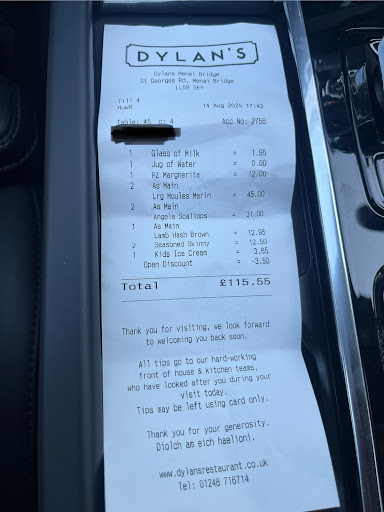 Read moreWould just like to say before this review that I am in no way fussy or have unrealistic expectations about having a meal out but I was really, really disappointed with Dylan's. Had a reservation for 2 for an evening and we were so looking forward to good food, a good atmosphere and a fabulous view. The view was spectacular but sadly, that was the best thing about the evening. The welcome and hostess were lovely and we were shown to our table upstairs. Our order was taken within a few minutes after sitting down. The drinks we ordered arrived separately, a good amount of time apart. We were there for the local fish and seafood, so opted for starters and a small main. For some dishes, the menu had options for both starter-sized and main meal sized dishes. We chose scallops for our starters and a starter-sized mussels and starter-sized chowder for our main course. Despite reiterating this a couple of times, this was lost in translation with our waitress. We received one scallops starter and another did not arrive. When we asked a different waitress (our original waitress was on her phone behind the bar), she arranged for us to have another. Unfortunately, my friend had already eaten her starter by the time mine came. The scallops were lovely however the pickled vegetables that came with them was very overpowering for the delicate flavour of the scallops. I absolutely LOVE pickles but it was just too much. The mains were delicious, the seafood chowder was excellent, with huge prawns and a generous amount of seafood. The flavour and freshness of the mussels were divine however there was such a great deal of grit in them that they were inedible as it was hurting my teeth chewing them. Again, I am a huge, huge fan of moules marineres however it was impossible to enjoy them. I understand that the mussels are incredibly fresh and to expect some grit, but every single one I ate was just awful. The sauce was very good though. Baring in mind I had barely eaten any food, our waitress didn't ask us how our food was and we were brought the bill. £75 was a lot of money to spend on only one of us eating a proper meal. But, we're British so we paid and left quickly. Was hoping this to be a new favourite on Anglesey but I can't say...