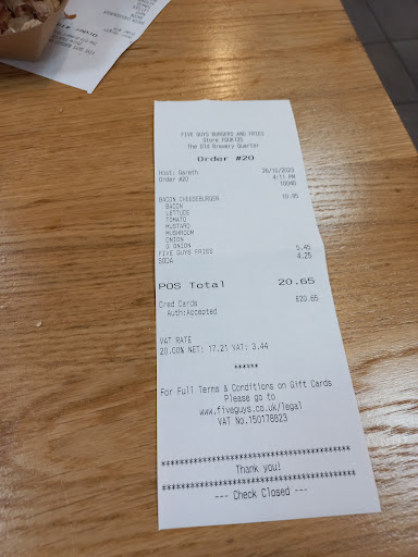 I visited this branch on Sunday 12th December and downloaded their app and ordered there. My payment went through and 119 and I was asked to approach the counter at 129. My two sons were hungry but waited patiently for their food. I approached the counter at 130 and the lady asked for my order number and I said I ordered online - she did not seem to understand what I was saying and said they need an order number; again I explained I ordered online and I was told to approach the counter; she then understood what I said and asked someone. The food was on the back bench and waiting to be wrapped. When the food eventually arrived at 140 the fries were cold and the cups for our drinks were missing from the order. Again I had to approach the counter and ask for the cups - obviously no one checked that the order was complete or correct. The server said he would get the manager who although I tried to explain my poor experience he then said I tried to apologise 3 time (whilst I was talking) you didn’t listen so he walked away - WHAT?!!!! When did British customer service go downhill so much - oh yes Five Guys is American so customer service does not matter.