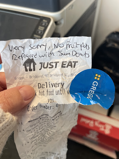 Read moreI’m not sure if it’s Gregg’s or just eat that I should be reviewing but I ordered a fruit bag for breakfast at work as I am watching the calories. When all the food came, everyone else’s order was fine, but there was a note on the receipt saying there were no fruit bags in stock, which is fine, but look at what they replaced it with 😂 Gave all us girls in the office a laugh anyway….. I suppose it does have strawberry...