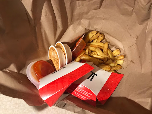 At the next counter I was passed the drinks and told to wait in the hatched area outside the car park. I asked for tomato sauce and extra napkins, instead of being given them I was told they would be in the bag.