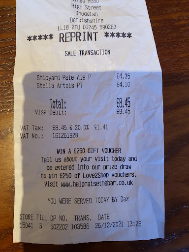 Read moreArrived at 11.50 am on Tuesday 6th March with my mother and young son. Doors where locked, after looking around found a sign stating that food was only served from 12PM, so we thought we would wait. After 20 minutes and the doors still being locked we looked inside to see a bloke vacuuming we waited another 5 minutes and knocked on the doors again, the gentleman shouted something at us and disappeared. After another 15 minutes we knocked again (12.30pm now), we were ignored again for 5-10 minutes before the gentleman returned with a sign which he put on the door stating they wouldn't be serving food until the next day. So annoyed that he didn't have the decency to either let us know sooner or at least open the door and personally speak to us. We have always used the Kings Head in Rhuddlan when in the area but not any more. On a good note we found a lovely tea room across the road which we will now...