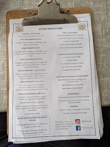 Been here several times and tried to give the cafe the benefit of the doubt but have been continuously disappointed. Especially over the summer period i’ve noticed that it appears incredibly understaffed. There’s almost always only one person working the counter; making drinks AND waiting tables which seems super stressful and like a lot of pressure to put on employees, I’ve also noticed the woman who I’ve assumed is the manager treating the wait staff poorly and being snarky. here’s some other things i’ve noticed: sticky tables that, contrary to prior reviews/feedback, i do not believe are due to the cleaning supplies as i’ve been in during times where customers have come and gone and there’s been no cleaning of the tables in between guests crumbs in the seats very dirty floors my friend got a chocolate milkshake once without whip cream and it appeared as if they just poured milk on top of the milkshake to fill the glass?? Manager (I assume) complaining about business taxes to customers (mind you, instead of helping the very busy staff with the jobs that actually need to be done) dated, dirty menus Food was okay but very greasy and seemed a bit overpriced for what it was considering there are better cafes for cheaper in Aber within blocks. soggy chips, spoons quality food at twice the price. I don’t want to bring small businesses down but there seems to be a massive sense of entitlement within management and how the business is run. This cafe treats being busy like it’s a blame all for a poorly run restaurant when in reality, tourist season is the time you want to prove your business as successful rather than reinforcing a bad look. I sincerely hope little devils can improve as on the outside it seems like a really nice, quaint...