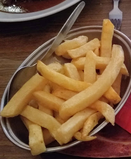 I, as I'm likely to miss my usual merluza (hake) in Spain this year, had Grilled Hake with Jacket Potato. The grilling had seared the outside of the fish leaving a rich plumbness to the inner fish, with some black pepper this was a fish of stunning quality. I don't often comment on Google Reviews about potato, but the Jacket Potato here had a soft inside and a crispy skin which is just how I like my potato, there was a bone or two of the fish left on the plate at the end, but absolutely nothing of the potato. Gorgeous.