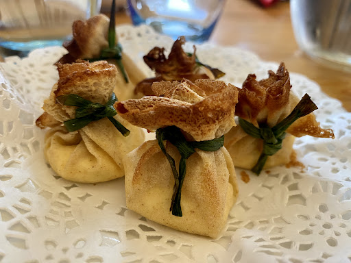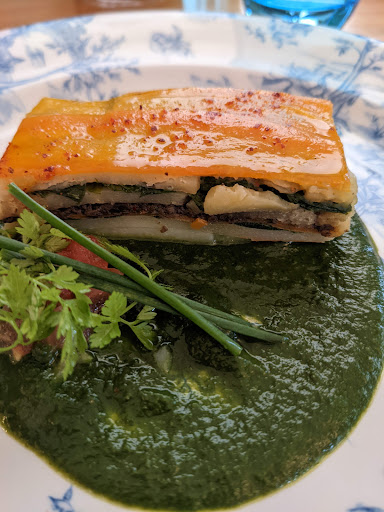 The menu exceeded all expectations... A thoughtful amuse bouche celebrating the humble delicious tomato was aburst with flavour The Millefeuille of vegetables with a prominent earthy spinach sauce and also tasted the gateau de courgette with gently layered ribbons of courgette atop a delicious filling with a rich tomato sauce. For main I indulged in the couscous/vegetable tagine and vegan tofu croquettes - beautifully sculpted and flavoursome croquettes and the vegetables sung in the tagine bathed in an umami rich sauce and never did I think cous cous could be cooked so beautifully. A carafe of Beaujolais to hand to complement these vegetables beautifully.